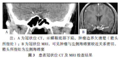 本例患者颅脑CT 检查显示蝶鞍左侧扩大,其内可见不均匀低密度影,蝶鞍底部骨质吸收变薄、下陷,边界欠清楚;MRI 检查显示蝶鞍内偏左侧可见一类圆形低信号影,肿瘤不均匀强化,且肿瘤与左侧颈内动脉海绵窦段相近,其影像学表现与垂体腺瘤并无差异,这也是患者被误诊为垂体腺瘤的原因。本例患者术后头痛症状消失,无内分泌紊乱症状及视力、视野改变,随访3 年疾病未复发。有研究表明,神经节细胞瘤复发率为4.5%,而腺瘤复发率低于3%。