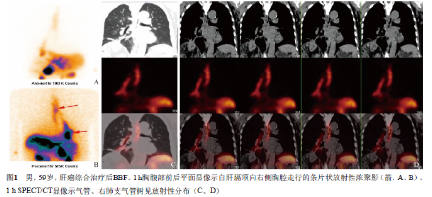 行肝胆动态显像及同机SPECT/CT断层融合显像(图1),1h胸腹部SPECT/CT显像示:长条形放射性浓聚影自肝顶区向右肺支气管延伸,考虑窦道与右肺支气管相通。临床诊断为肝癌综合治疗后BBF,合并肺炎、