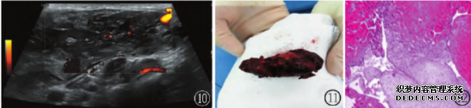 超声检查可见范围约69mm×23mm的混合回声包块,CDFI示其内可见血流信号(图10)。手术所见
