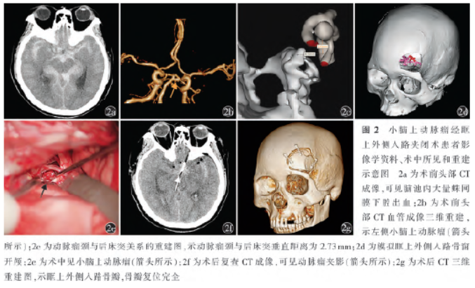 取左侧眶上外侧入路,暴露出第二间隙后分离出动脉瘤体,载瘤动脉为小脑上动脉(图2e),在第二间隙使用跨血管动脉瘤夹夹闭动脉瘤,可见瘤体完全夹闭,大脑后动脉及小脑上动脉保留完好。术后复查CT示鞍上偏左见金属动脉瘤夹影,动脉瘤夹闭完全(图2f),CT三维重建示骨瓣复位完全(图2g)。术后予止血、抗感染、脱水、营养神经等治疗,行蛛网膜下腔持续引流清除蛛网膜下腔出血。