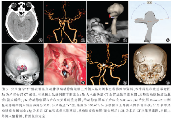 患者于入院前4d突发头痛伴头晕,逐渐加重,有恶心呕吐,无抽搐,无大小便失禁。急查头部CT见鞍上池高密度影,示蛛网膜下腔出血(图3a);CTA三维重建示基底动脉顶端动脉瘤(图3b)。动脉瘤直径8.39mm,瘤颈宽径4.87mm,瘤顶指向前方,瘤颈高于后床突5.83mm(图3c),动脉瘤两侧大脑后动脉分叉呈“Y”型,分叉角为160.60°(图3d)。入院后予止血、抗血管痉挛、抗凝、降血压等对症治疗,于2015年12月10日行右侧眶上外侧入路动脉瘤夹闭术,模拟眶上外侧入路骨窗开颅(图3e)。