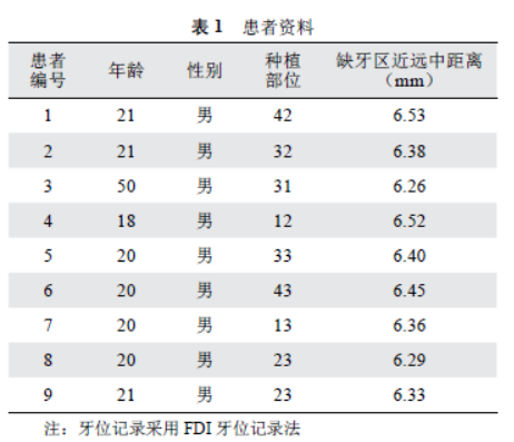 1)一般资料:选取在2016年1月至2018年12月,于吉林大学口腔医院口腔种植科就诊的9名主诉为要求修复单个牙脱落或缺损的患者。经检查所有患者口腔卫生状况良好,身体健康,无全身性疾病。