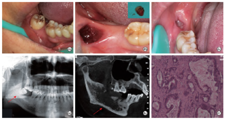 图3 1例MAJ患者拔牙前后口内照、CT及病理切片(苏木精-伊红染色,×40)。3a:拔牙前口内照示48冠周牙龈红肿;3b:48拔除术后创口及患牙;3c:拔牙后4个月示48拔牙创仍未愈合;3d:拔牙前全景片示48阻生,根尖及牙周骨质吸收;3e:拔牙后4个月CBCT矢状位示溶骨型破坏边缘呈浸润型改变;3f:术中切除右下颌骨切片示致密的纤维组织背景下大量腺管样癌细胞浸润