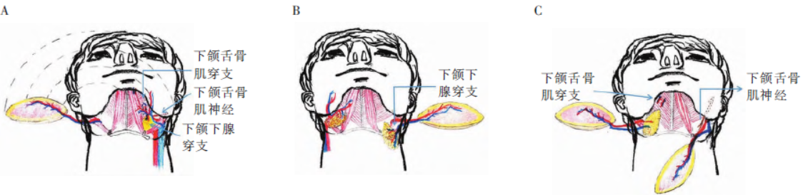 图1各颏下动脉穿支切断示意图。A.各穿支和神经解剖位置,虚线表示皮瓣旋转半径可修复范围;B.下颌下腺穿支位置及切断后示意图;C.下颌舌骨肌神经及下颌舌骨肌穿支切断后解剖示意图。