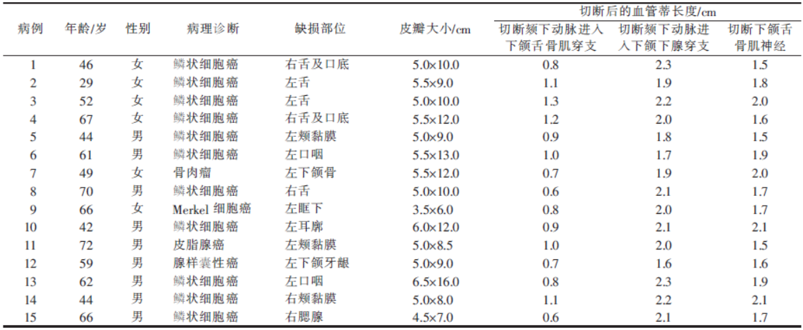选取2019年1月—2021年2月于中国医科大学附属口腔医院口腔颌面头颈肿瘤外科就诊,接受口腔及颌面部恶性肿瘤切除手术并采用延长血管蒂后的颏下动脉穿支皮瓣转移修复术后软组织缺损的患者15例,所有患者均有完整的病历信息资料。术前临床检查或影像学资料示患者均无颈部淋巴结转移。