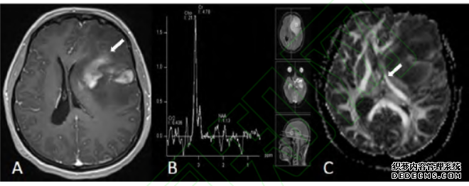 图1左侧额颞叶GBM。A:增强T1WI病灶显著均匀强化,“裂隙征”、“握拳征”(箭头);B:MRS示病灶实性部分NAA峰及Cr峰明显减低,Cho峰明显升高;C:DTI示病灶周围区域白质纤维束受压推移(箭头)。