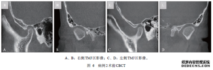 影像学检查:锥形束CT(cone beam CT,CBCT)及螺旋CT示双侧冠突增长(图1E、F、H、I),高于髁突水平,Dicom数据三维重建显示双侧冠突明显伸长,超过颧弓上缘(图1D、G,图3A~C);双侧髁突未见明显异常(图1E、F、H、I);髁突顶水平的轴位CT截面仍可见冠突影像(图3D)。