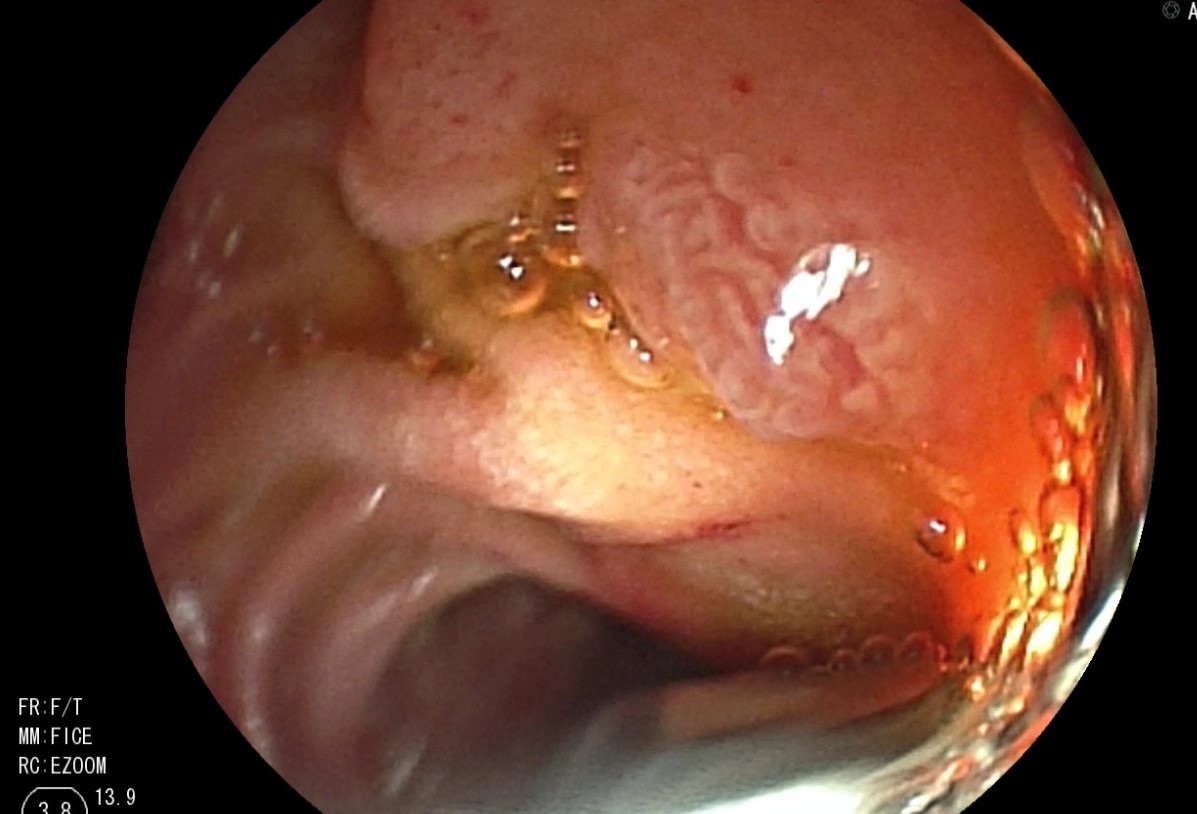 行腹部CT扫描后,初步鉴别诊断包括恶性肿瘤(如胰腺癌或神经内分泌肿瘤)、急性胰腺炎所致实质炎症、胰腺囊肿或胰腺动静脉畸形(arteriovenous malformation,AVM)。内镜检查时,可见少量血液从乳头部流出(即胰管