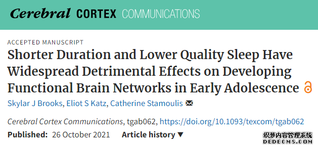 2021年10月26日,美国哈佛医学院、波士顿儿童医院的研究人员在 Cerebral Cortex Communications 期刊上发表了一篇题为:Shorter Duration and Lower Quality Sleep Have Widespread Detrimental Effects on Developing Functional Brain Networks in Early Adolescence 的研究论文【8】。