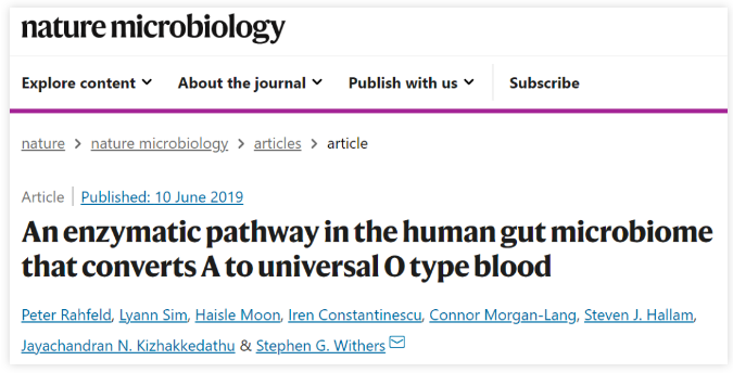 而在2019年6月,加拿大不列颠哥伦比亚大学的研究人员在 Nature Microbiology 期刊发表了题为:An enzymatic pathway in the human gut microbiome that converts A to universal O type blood 的研究论文。