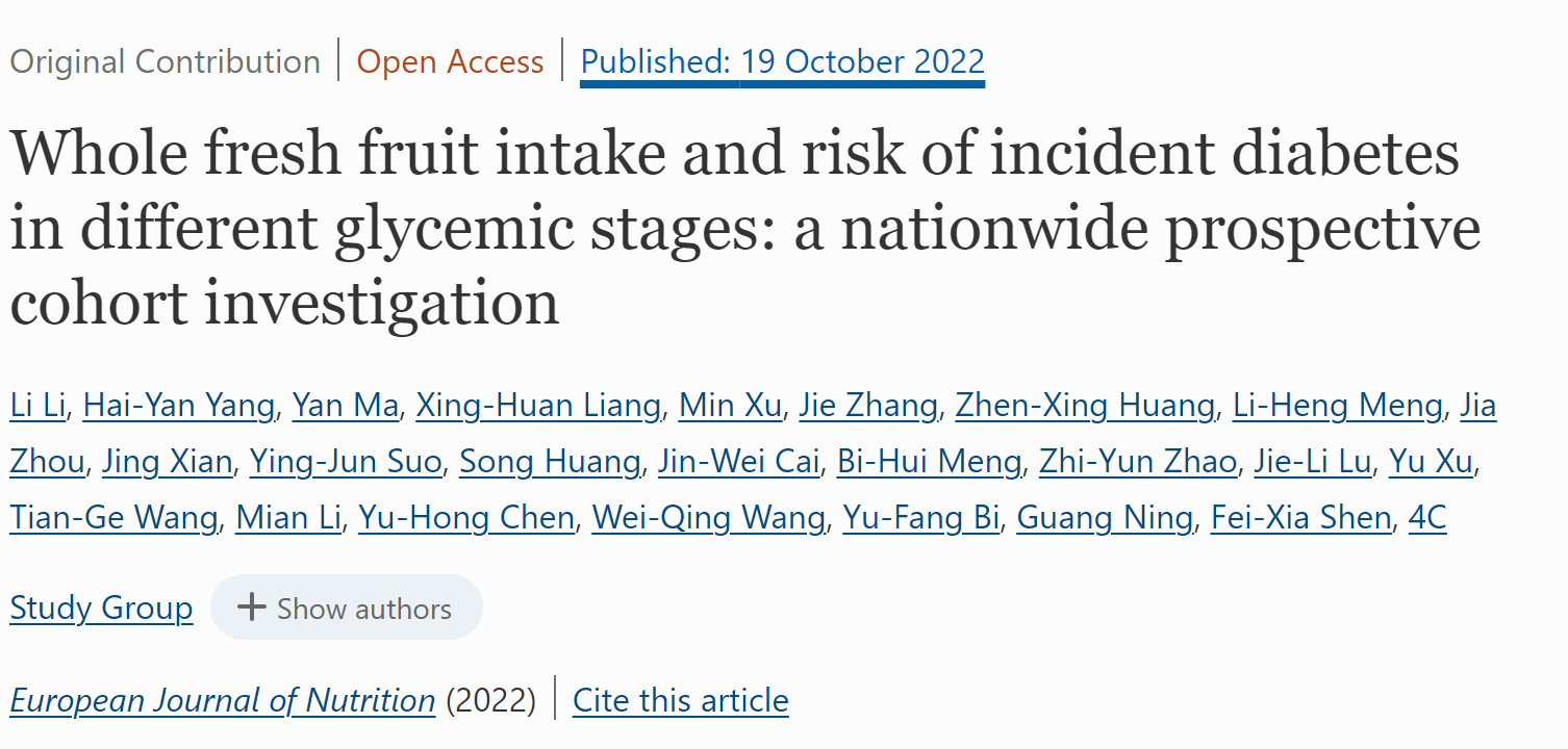 [1]Li, L., Yang, HY., Ma, Y. et al. Whole fresh fruit intake and risk of incident diabetes in different glycemic stages: a nationwide prospective cohort investigation. Eur J Nutr(2022).https://doi.org/10.1007/s00394-022-02998-6