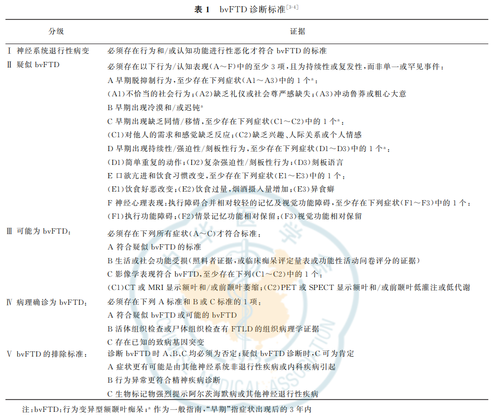 推荐1:FTLD临床诊断借鉴EFNS指南、国际bvFTD标准联盟及中国额颞叶变性专家共识发布的诊断标准(Ⅰ级推荐,A级证据)。