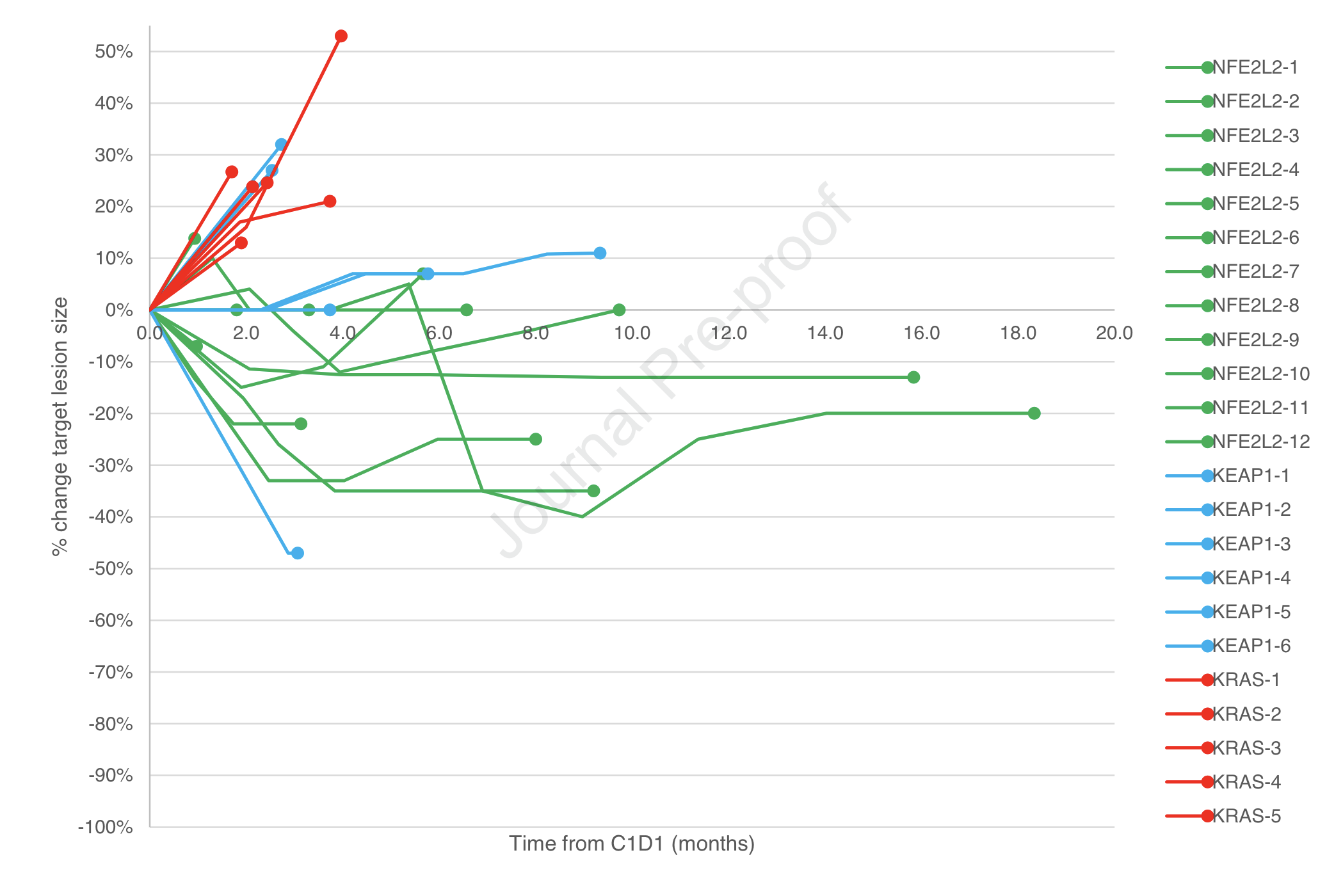可评估疗效的患者包括12例携带NFE2L2突变的LUSC患者,6例KEAP1突变的LUSC患者和6例KRAS/KEAP1或NFE2L22共突变的NSCLC,其ORR分别为25%(3/12)、17%(1/6)和0%(0/6)(图1);中位无进展生存期(PFS)分别为8.9个月、3.7个月和2.1个月。
