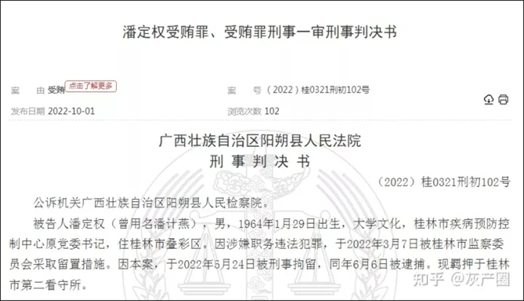 据济南时报10月13日报道,广西桂林市疾控中心党委书记潘定权被查,一审判决书公开,受贿364万元,判刑10年。