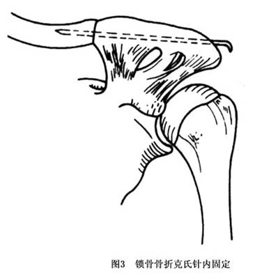 手术治疗指征:开放骨折;合并血管、神经损伤的骨折;有喙锁韧带断裂的锁骨外端或外1/3移位骨折;骨折不连接。内固定方法可视骨折的类型和部位等不同,选择"8"字钢丝、克氏针或钢板螺丝钉固定。