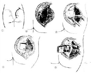 (1)切口根据臀部脓肿及骨病灶的情况加以选择。①从髂后上棘到股骨大粗隆的连线上,长约12cm(Roaf),②切口是从髂嵴的后1/3处开始沿髂嵴外唇弧形式至髂后下棘,自髂骨骨膜下向外侧剥离臀大肌,显露髂骨外板和骶髂关节的后侧。