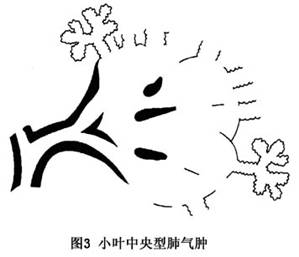 (1)小叶中央型肺气肿:多见于肺上部,是由于终末细支气管或一级呼吸性细支气管因炎症而致管腔狭窄,其远端的二级呼吸性细支气管呈囊性扩张,其特点是囊状扩张的呼吸性细支气管位于二级小叶的中央区(图3)。 医学百科网 | YxBaike.Com
