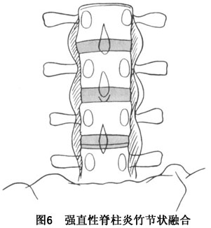 ①韧带骨赘(即椎间盘纤维环骨化)形成,甚至呈竹节状脊柱融合(图6)。