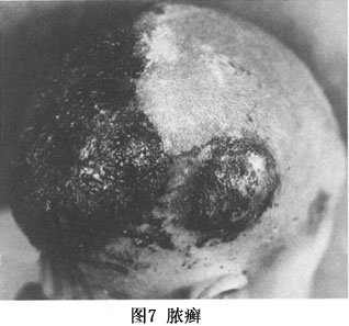 4.脓癣 为人体皮肤对亲动物性或亲土性真菌感染发生的强烈炎症反应。脓癣亦多发生于儿童,尤其是学龄前儿童。最初表现为化脓性毛囊炎,群集性小脓疱融合形成隆起炎性结节或肿块,界限清楚,触之较软,表面有与毛囊口一致的小脓点,似蜂窝状,挤压时有多孔溢脓现象(图7)。毛发松动而易拔除,自觉疼痛或无症状。若继发细菌感染,则有明显疼痛及压痛。附近淋巴结常肿大。损害常单发,亦有少数多发。愈后常伴瘢痕及秃发。 医学百科网 | YxBaike.Com
