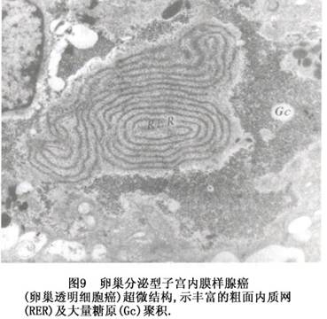 ③透明细胞腺癌(clear cell adenocarcinoma):少见,约占子宫内膜癌的1.5%~5%。此腺癌的形态特征是由胞浆透明、富含糖原的透明细胞和鞋钉样细胞构成;透明细胞经组织化学PAS-酶消化后仍阳性,电镜观察细胞质内有大量糖原聚积(图8),证明癌细胞之所以透明,系因含大量糖原所致;鞋钉细胞的特征是细胞基底部细长,顶端膨大,内含1~2个大而深染的核,突起于上皮层表面,或突向腺腔(图9)。癌细胞的排列结构,可呈实性片状、管囊状、乳头状,或这些结构的混合。 医学百科网 | YxBaike.Com