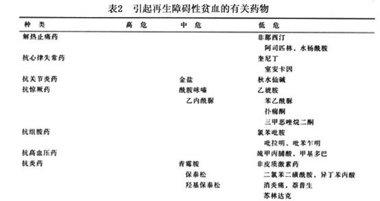 4.放射线 放射线诱发的骨髓衰竭是非随机的,具有剂量依赖性,并与组织特异的敏感性有关。造血组织对放射线较敏感,致死或亚致死剂量(4.5~10Gy)的全身照射可发生致死性的急性再障,而极少引起慢性再障。在日本原子弹爆炸幸存者中仅几例发展为迟发的再障。大剂量局部照射也可引起骨髓微环境严重损伤,这种照射剂量大大超过了祖细胞的致死剂量。长期接触小剂量外部照射,如放射科医师或体内留置镭或钍的患者可发生慢性再障。有报道指出,在短期接触放射线后数月至数年可发生再障。放射线主要作用于细胞内的大分子,影响DNA的合成,其生物效应是抑制或延缓细胞增殖。无论全身照射或局部照射均可损伤造血干细胞及微环境而导致骨髓衰竭。能引起再障的药物见表2。