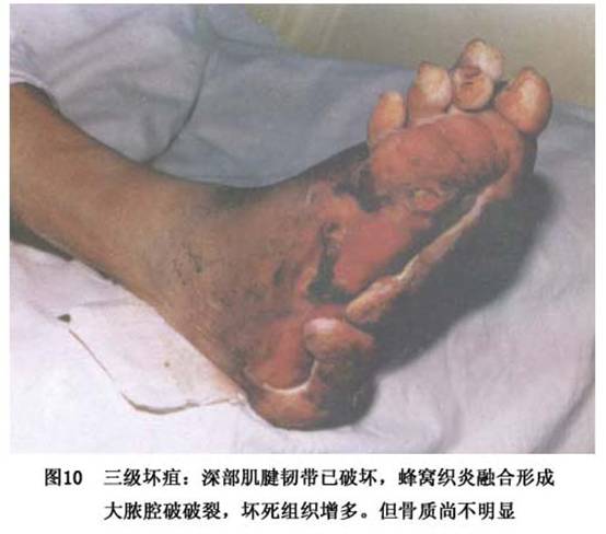 Ⅲ级:肌腱韧带组织破坏,蜂窝织炎融合形成大脓腔,脓性分泌物及坏死组织增多,但骨质破坏尚不明显。