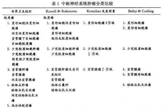 3.分类 中枢神经系统颅内肿瘤分类方法很多,比较具有代表性的主要有以下几种,见表1。Bailey和Cushing的分类能反映肿瘤组织的来源及恶性程度,长期以来被世界多数地区的神经外科和病理科所采用。在此基础上衍生出一些新的分类方法,如Kernohan的Ⅰ-Ⅳ级分类法,Russell的胶质瘤分类。较有影响的是Kernohan提出将胶质瘤,包括星形细胞瘤、少突胶质细胞瘤、室管膜瘤和神经源肿瘤等,按其分化程度分为Ⅰ-Ⅳ级,根据这个分类似乎能够容易地判断肿瘤的发展和病人的预后,因此受到临床医师欢迎,在国内国际上使用多年。但此分类法也有缺陷,如同一肿瘤在不同部位,细胞分化即可不同,有些混合瘤无法分级,而有些肿瘤分级意义不大。在此基础上世界卫生组织制定了新的分类法,其特点是分类细致,包括了颅内发生的各种肿瘤类型,吸收了既往各种分类的特点和长处,既反应了肿瘤的形态学,又表明肿瘤的来源,并采用间变这一概念,可认为是目前最好的分类。
