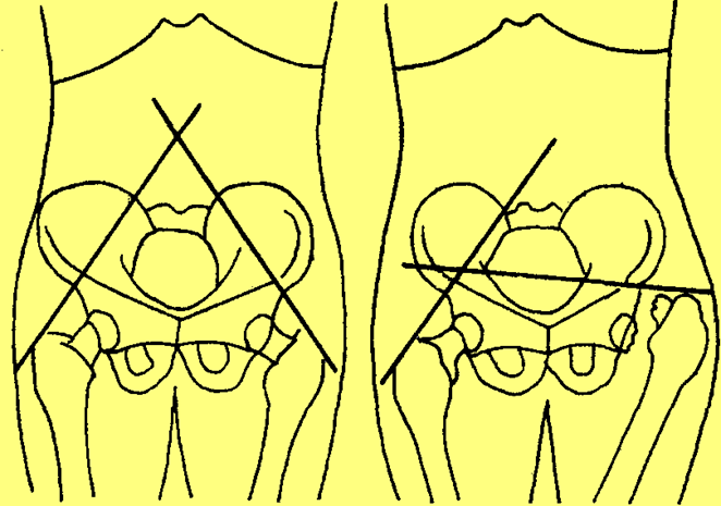 患者仰卧位,双下肢伸直于中立位,两侧髂前上棘在一平面,从两侧髂前上棘与大粗隆顶点分别连一直线,正常时两线延长交于脐或脐上中线。若一侧大粗隆上移.则延长线相交于脐下且偏离中线。