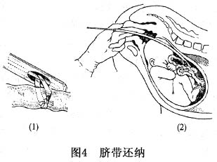 脐带还纳法:脐带已脱出阴道外或仍在阴道内,而宫口仅部分扩张胎心音尚好者,可勿作干扰,因虽脱垂而血运能维持。但应迅速采取剖宫产术。在手术准备期间仍要严密监护。如脐带搏动缓慢或停止,说明脐带受压,血运有受阻情况,除取臀高位外,应立即行脐带还纳术。脐带还纳有种种方法,原则上以迅速、简便、触动少为宜,可凭手术者之经验选用。纱布复位法是用无菌纱布将脱垂之脐带松松裹住,用手先将先露部推上,连同纱布一起将脐带团由空隙处送回宫腔,然后按压宫底,将胎头推下,在顶先露借助纱布块的堵塞,可防止脐带再度滑出。但此法一般用于宫口扩张较大者,否则纱布不易填入。臀位时脐带还纳理论上应挂于肢体,但往往不易成功,宫缩时更易脱出。脐带还纳器法,由于还纳器的不同,应用经验亦不一。山东大学齐鲁医院应用肛管加大其旁孔,内置金属芯。将脱出之脐带套一纱布条,以金属芯将套妥之纱布条压入肛管之旁孔,然后手持肛管送入宫腔尽可能高处,脐带随同而上。然后拔出金属芯,再退出肛管,脐带与所套纱布条留于胎先露部以上。此法在宫口扩大2~3cm者即可进行(图4),每有还纳后胎心音好转者。但应强调脐带还纳法有可能当时失败或不久脐带又重复垂下,切忌反复操作,加重胎儿窘迫程度,延误抢救时机。故如还纳成功,胎儿窘迫好转,应果断选择剖宫产术,最好勿再搬动,必要时用手或纱布卷填堵于宫颈口,即就产房进行。还纳后胎心音仍不佳甚至消失者,或还纳不成者,唯有保障母体安全,注意防止产后感染。
