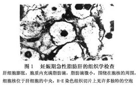 电镜检查细胞核位于细胞的中央,周围充满脂肪滴。线粒体肿胀,基质的密度增加。脂肪滴由游离脂肪酸组成,不是三酰甘油。分娩结束后肝脏的病理改变迅速改善,无后遗症,不会发展为肝硬化。