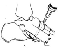 图31 切除舟、楔关节软骨(A) 于舟、楔骨跖侧钻孔(B)