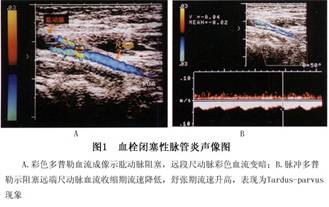 (2)彩色多普勒血流成像:显示狭窄段血流流道变细,不平整,颜色呈花色,严重狭窄或闭塞时,彩色多普勒可见血流变暗或消失,其远段动脉血流颜色亦暗淡(图1A)。