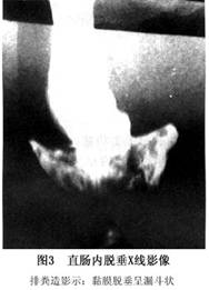 2.排粪造影 是诊断直肠内脱垂的主要方法。其影像特征有:①直肠内黏膜套叠:在排便过程中肛缘上6~8cm处直肠前后壁出现折叠,并逐渐向肛管下降,最后直肠下段变成漏斗状的鞘部(图3),厚约3mm的环形套叠(图4) ;②直肠内全层套叠:环形套叠环的厚度>5mm(图5)。 医学百科网 | YxBaike.Com