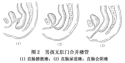闭锁可以是单纯闭锁,也可合并各种瘘管,瘘管的发生率约为50%,尤以女孩多见。男孩可有直肠膀胱瘘、直肠尿道瘘及直肠会阴瘘3种,见图2。女孩可有直肠阴道瘘、直肠前庭瘘及直肠会阴瘘3种(图3)。 医学百科网 | YxBaike.Com