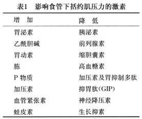 1.第一抗反流屏障-食管下括约肌 20世纪80年代前期,多数学者认为食管下括约肌在解剖结构上实际并不存在,而仅是代表一种功能的名称。近年来,随超微解剖研究的深入,提示确实存在这种肌肉结构。胎儿食管功能的成熟发生在妊娠末期至出生后第1周。食管下括约肌位于食管末端与胃相连接处,其相应的食管黏膜有增厚改变,呈“Z”线,在抗反流中也起一定的作用。食管下括约肌压力(LESP)可因迷走神经兴奋而增加。经过较长期研究观察到某些激素可以影响食管下括约肌压力(表1)。 医学百科网 | YxBaike.Com