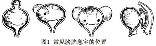 先天性憩室常由多余的输尿管芽及未闭的脐尿管、先天性膀胱壁肌层局限性薄弱点膨出所致,憩室多为单发,憩室壁含膀胱全层,多见于儿童,下尿路无梗阻。膀胱憩室亦可由继发性因素所致,多由于下尿路梗阻所致,而继发于下尿路梗阻的膀胱壁自分裂的逼尿肌肌束间膨出形成憩室,常为多发性,憩室壁有黏膜小梁(此类憩室中不含有膀胱壁的各层组织,故又称假型憩室),多见于成人男性,同时存在逼尿肌增生(图1)。 医学百科网 | YxBaike.Com