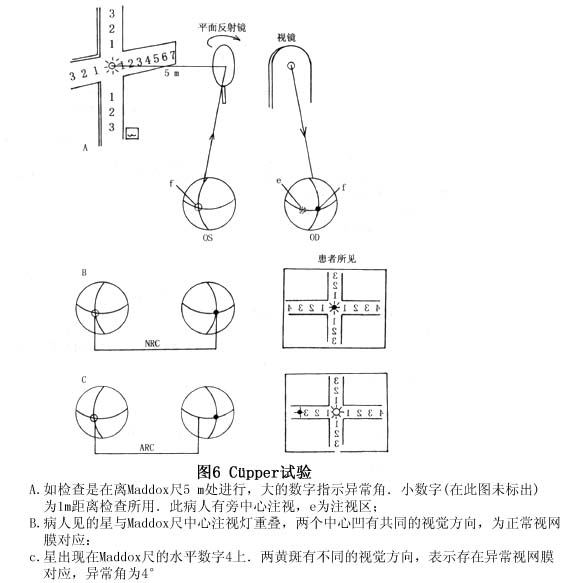 没有投射镜者可用手电筒比较两眼的Kappa角,估计弱视眼为中心注视抑或旁中心注视。如为中心注视,则角膜光反射必位于两眼的相同位置,说明两眼Kappa角的大小和“正”“负”完全相同。如为旁中心注视,则两眼的Kappa角有显著差异。用手电筒估计注视性质,方法简便易行,不用特殊器械,但结果并非绝对准确,极轻度的旁中心注视不易察觉。