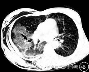 Ⅲ型 病灶位于肺表面,多由于肋骨断端刺破肺组织所致, 常合并气胸;