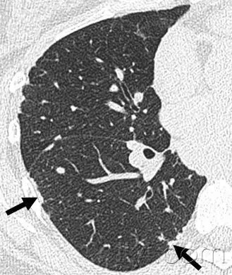 CT—本征象是薄的曲线样密度,厚度1-3mm,离胸膜不到25px,与胸膜壁平行,(图)。如果见于卧位检查病人肺的后下部,则可以是不张的正常肺,当病人俯位行CT检查时,可以消失。也可以见于肺水肿病人,或者肺纤维化(可见其它征象)。虽然石棉肺有描述,但是不是石棉肺的特异性征象。