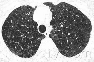 CT扫描:肺结构扭曲,常与肺纤维化同时发生,有肺体积的减小。