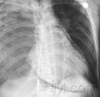 平片和CT:纵隔气肿在胸片上显示为带状的透亮影,大多数垂直走向,见图。部分低信号条带影可以勾勒出血管和支气管的边界(参加心包气肿) 医学百科网 | YxBaike.Com