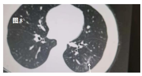 随着病情发展,实变区域开始吸收,密度减低,逐渐成为磨玻璃密度影,就像一颗糖 融化了,有效的治疗或机体的免疫力可以逐步战胜病毒,炎症会进一步吸收,范围逐步缩小,或许会留下纤维条索灶。这对于患者而言,可能真的就和得了一场流感差不多。比如图8
