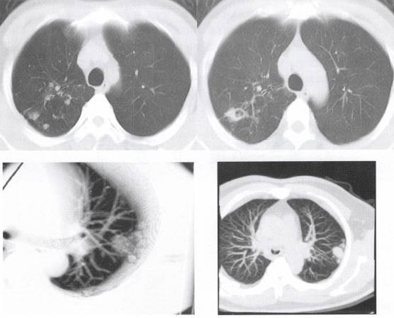 图1示右上肺病灶周围多发斑点状结节影及纤维条索状阴影
