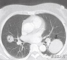 肺癌空气支气管征表现为结节内见到充气的支气管,常伴见分叶征、毛刺征、胸膜凹陷 征、空泡征。病理基础为一方面是癌细胞包围和浸润正常或异常的支气管,导致支气管出现 扭曲、扩张、变尖或中断,可为单支或多支,在走行方向上无一定的规律性;另一方面是支 气管近端癌性浸润或分泌物潴留成活瓣样通气的结果。肺癌的生长方式和肺支气管结构完整 与否是肺癌空气支气管征存在的决定性因素,据文献报道肺癌中出现空气支气管征的概率为 65%,且有此征象的肿瘤与无此征象的肿瘤相比,具有相对低度恶性的生物学行为。空气支 气管征多见于3cm以下的细支气管肺泡癌、腺癌、部分鱗癌及鳞腺混合癌。有资料显示, 直径<3mm的周围肺结节出现空气支气管征,是周围型肺癌特异性很高的征象,在肺癌诊 断中具有相当的价值。亦有资料显示,空气支气管征能进一步提示肺癌的组织类型,以腺癌 及肺泡癌多见,鳞癌相对少见,据统计,在肺癌内出现空气支气管征时,腺癌与肺泡癌的危 险度约3倍于鱗癌。见图11、图12。