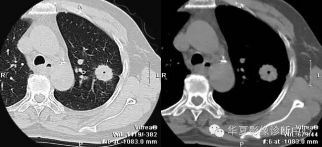 空泡征是一个非常熟悉的名词了,这一征象指病灶内1-2mm(或<5mm)的点状透亮影,单个或多个,也主要见于早期肺癌,其病理基础主要是尚未被肿瘤破坏、替代的肺结构支架如肺泡、扩展扭曲的未闭细支气管等,部分是肿瘤坏死腔、含粘液的腺腔结构以及乳头状癌结构间的含气间隙。此外上包括未被肿瘤占据的含气肺组织及未闭合的或扩张的小支气管。此征主要见于细支气管肺泡癌和腺癌,也可见于鳞癌。肺窗下观察为小泡状模糊低密度灶,纵隔窗为小泡状透亮影。