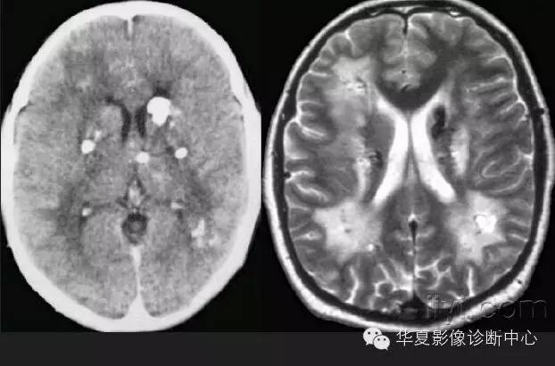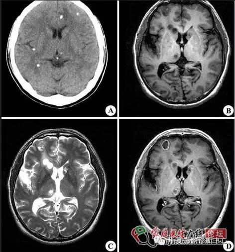 脑猪囊尾蚴病在CT平扫大多表现为小园形囊性病灶,大小为4~6mm,CT上为类圆形低密度内可见点状高密度,即所谓黑靶征。或在MRI上呈长T1长T2信号,部分病灶在T1WI上黑色的低信号内见到点状高信号,即黑靶征;在T2WI白色高信号内见到点状低信号,即白靶征。