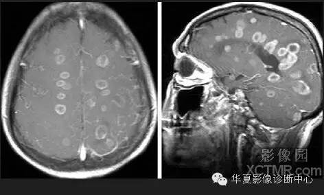 脑脓肿包膜期,病变周围形成肉芽组织;若包裹不完全则可在病灶旁形成子病灶,子灶化脓形成子脓肿。CT或MRI增强扫描。脓肿壁明显强化,形成多个相互连接的大小相同或不同的环。