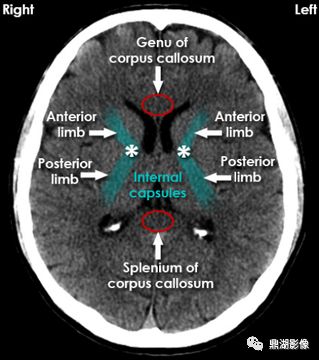 Genu of corpus callosum:胼胝体膝部;Splenium of corpus collosum:胼胝体压部;Internal capsules (posterior anterior limb):内囊(后 前肢) 医学百科网 | YxBaike.Com