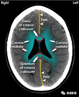 Falx:大脑镰;Genu corpus callosum:胼胝体膝部;Splenium corpus callosum:胼胝体压部;corona radiata:放射冠