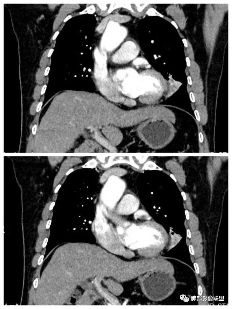 4.增强扫描左肺门区块影轻度强化,强化程度轻于舌段周围不张肺组织。